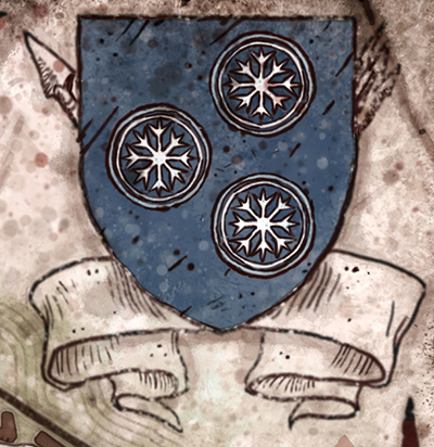 Circa 1357 DR, the badge of Neverwinter was three white snowflakes of different shapes contained in silver and blue halos. These were arranged vertically as if falling and offset so they pointed to the right. They were linked by a white swirl.[2][3]