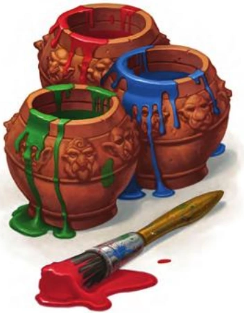 When placed upon an artist's paintbrush, these pigments flowed from the brush to create a real item based upon whatever the wielder concentrated upon. This process took ten minutes. A single pot of this magical pigment had enough material to create up to 1,000 ft³ (28 m³) over a 100 ft² (9.3 m²) area.[3][4][5][6][8]