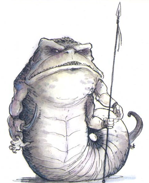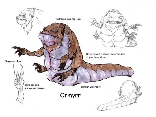 Ormyrr resembled a giant worm with a powerful torso, two sets of short muscular arms with sharp talons, and a huge head that looked somewhat like that of a frog. Their large maws were fanged. Ormyrr's flesh was of pale white, almost mushroom-like color, with a purple underside. Their eyes were crowned with thick bony ridges[1]. Males and females appeared completely identical to any non-ormyrr, and the creatures themselves were able to distinguish sexes by scent, according to sages.[2]
