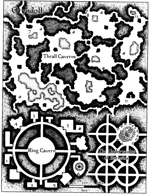 Surface Oryndoll was located in the Underdark beneath the Shining Plains.[11] It lay ninety miles northwest of Ormath and 90 miles northeast of Lheshayl.[6] It was slightly more than 26 miles beneath the surface.[3]