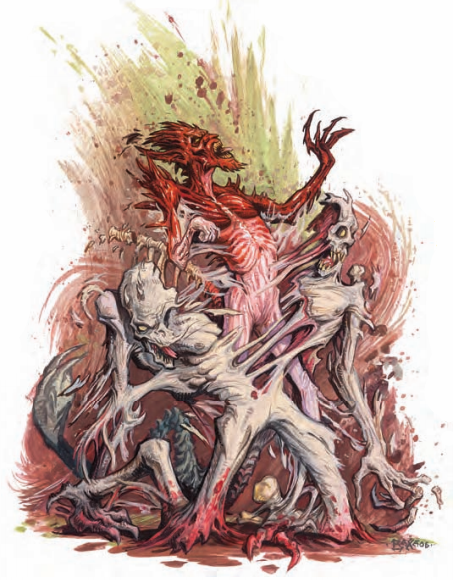 Osyluths were 9‒9.5 ft (2.7‒2.9 m) tall creatures with dry, sickly skin that seemed tautly stretched over every bone in their body. Despite being 500 lb (230 kg) creatures, their frames were incredibly gaunt husks so emaciated that they seemed skeletal.[3][5] Their tails were those of giant scorpions while their heads looked like menacing skulls. The putrid stench of rot surrounded their fearsome forms.[4]