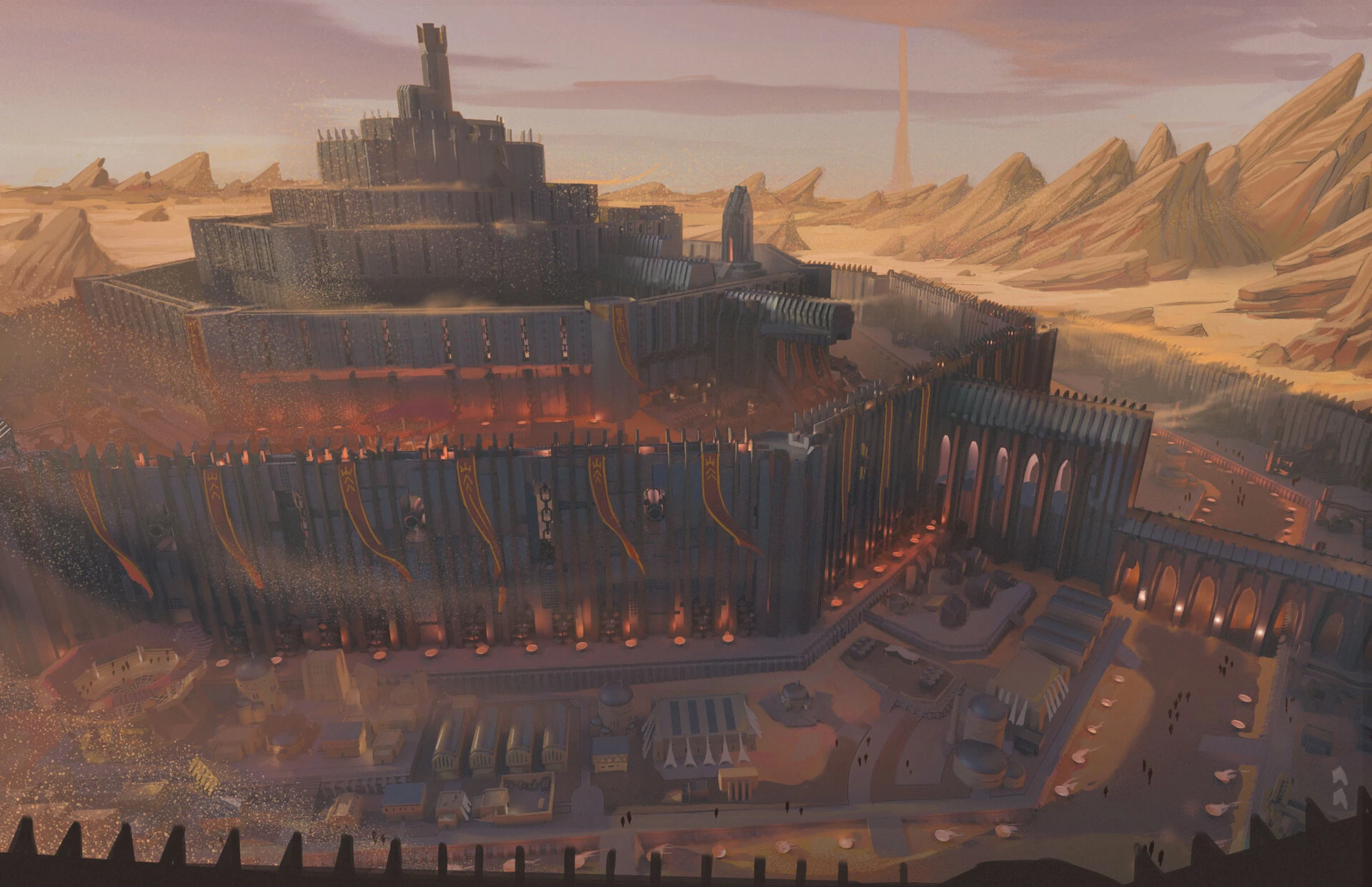 Rigus was more of a military fortress than a town. It was built on a massive hill, divided into seven rings that rose to a pinnacle. Massive octagonal iron battlements and walls separated each ring, as well as the gate-town itself. The uppermost level was called the Crown. Entrance into Rigus was through several gates in the lowest, and largest, ring. The exterior of the lower wall was treated with a mild poison to prevent rust monsters from feeding on it.[1]