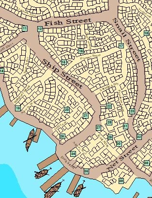 Ship Street connected Fish Street with Dock Street in Waterdeep's Dock Ward. It branched south from Fish Street to meander south toward the waterfront and end on Dock Street. Other roads connecting with Ship Street included Aline's Way, Keel Alley, Odd Street, Presper Street, Shipwright's Square, Shrimp Alley, Siren Street, and Sternpost Street.[1][2][3][4]