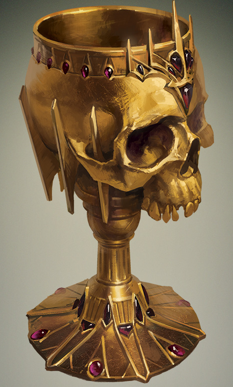 The chalice was constructed from a human skull and encrusted with jewels. In the 1490s DR, it had an intrinsic value estimated at 2,500 gold pieces, but collectors in large cities might have bid as much as 10,000 gp to own it.[1]