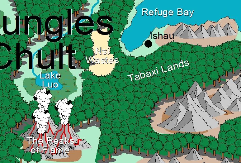 A late 15th century DR map of Chult showing the Sky Lizard Mountains in the southeast.