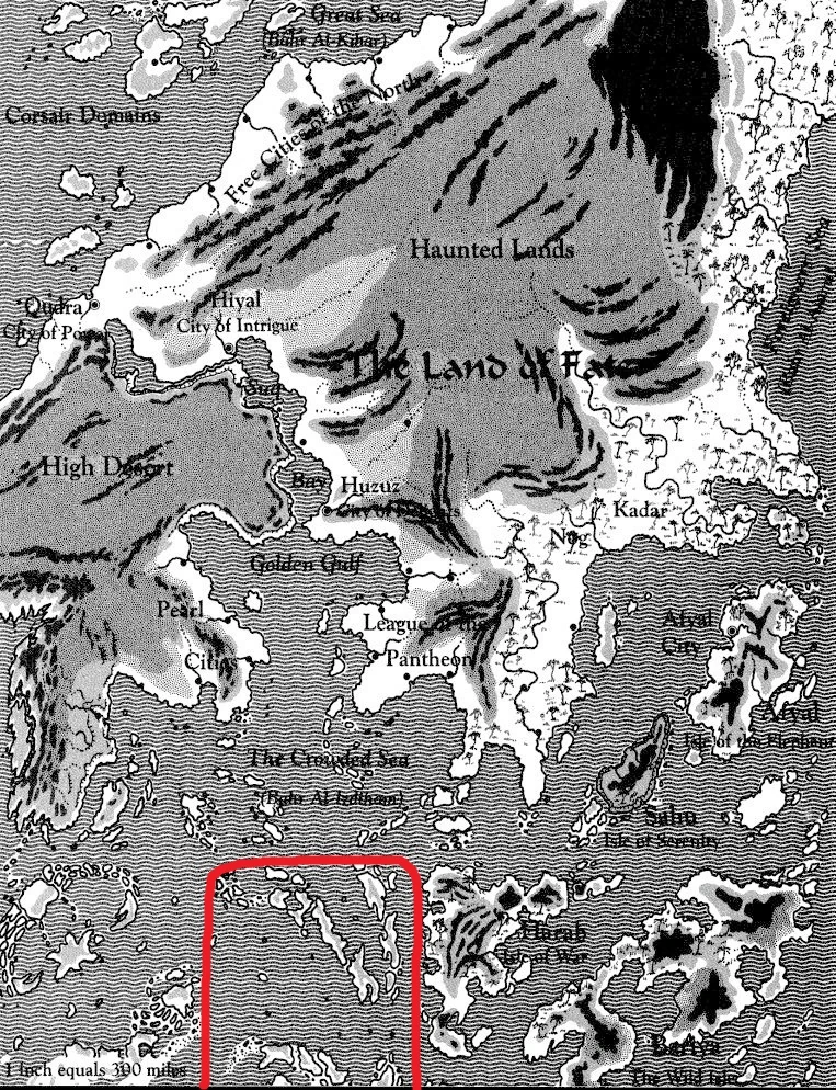 South Zakhara comprised the central part of the Crowded Sea with myriad islands, most of them within three large archipelagoes where civilization gave way more and more to the untamed wild and its mysteries: Nada al-Hazan, the Steaming Isles, and the Islands of the Utter South.[4][5][6][7]