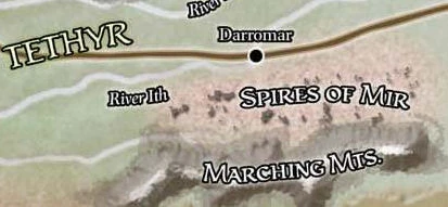 The Spires of Mir were a wasteland of strange stone spires located in southern Tethyr, just north of the Marching Mountains.
