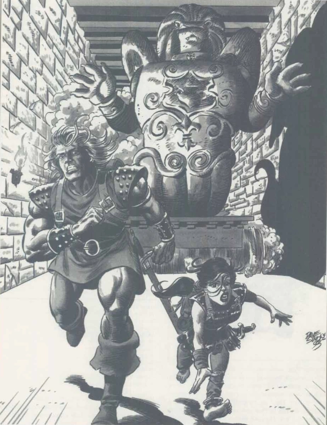 Two adventurers try to outrun a stone juggernaut in a dungeon.