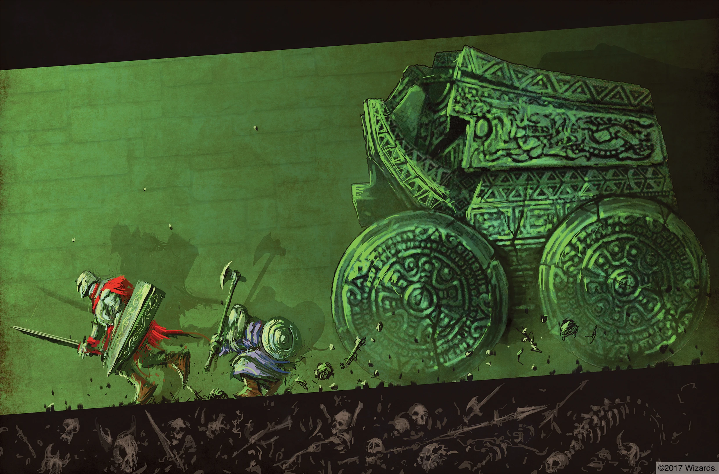 A stone juggernaut guarded the Eye of Zaltec in the Forbidden City of Omu in Chult by the late 1480s DR. It was placed there as a trap by the archlich Acererak, who named it "Napaka", after a deceased queen of Omu, and was set to emerge from a secret door and roll inescapably after those who disturbed it. An enchanted iron scepter with an adamantine head had the power to destroy the juggernaut when it struck the construct; it was stored in the hand of the remains of the real Napaka in her sarcophagus.[7]