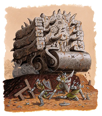 These heavy constructs were generally very slow,[1][2] and clumsy and difficult to turn,[1][2][5] but some could quickly accelerate to moderate paces,[1] and others were made swift.[5] Either way, once they caught up, they could run into, knock over, and crush their opponents, often to death. The crushed creatures took terrible damage, and a large assortment of their items could be instantly destroyed. Survivors were usually knocked back or to the side.[1][2][5] Often, their low speeds were not too much of an issue, as those with huge limbs or magic could grab and force their smaller opponents under their crushing body.[1][2] Stone juggernauts dealt about twice as much damage to regular structures.[5]