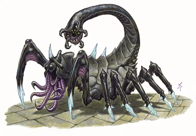 Stonesinger superficially resembled a scorpion at first glance, with an obsidian-black carapace with a tail arching forward over the back. However, it walked on a dozen legs,six on each side, each tipped in a crystal hard enough to pierce stone, and had a set of six flexible claws on the front of its head. The tip of tail, instead of having a scorpion's stinger, was a lamprey-like mouth ringed with five short, hooked tendrils.[1]