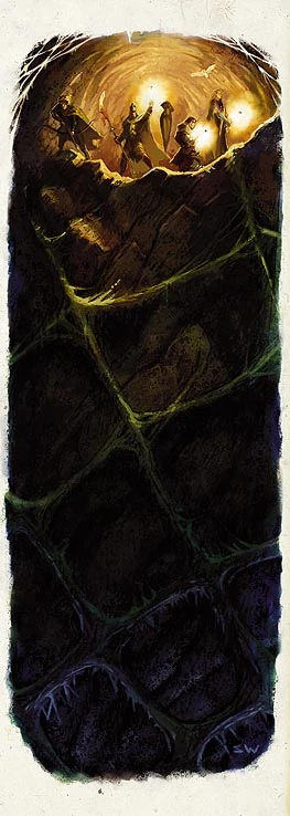 Despite the presence of a decent-sized garrison and its sizable wizard school, Szith Morcanes unique construction was perhaps its most significant defense. Located on the side of a chasm, the only navigable way around the outpost was along a network of webbing. Any who stray from the few "safe" and non-sticky strands of web fall prey to a fiendish monstrous spider which allowed a dedicated web team to stick to the "safe strands" and patrol the cavern quite effectively.[10] In addition, both the Inverted Tower and House Morcane were protected by powerful magical wards.[8][11]