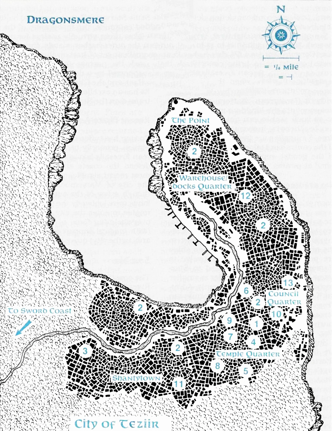 Teziir (pronounced: /tɛˈzɪər/ teh-ZEER[4]) was a protectorate of Cormyr,[5] that formerly boasted itself as the largest free city on Dragon Coast. For nearly a century, Teziir was an independent trade city that attempted to displace Westgate as the principal trade city for goods traveling from the Sword Coast to the Inner Sea.[6][2]