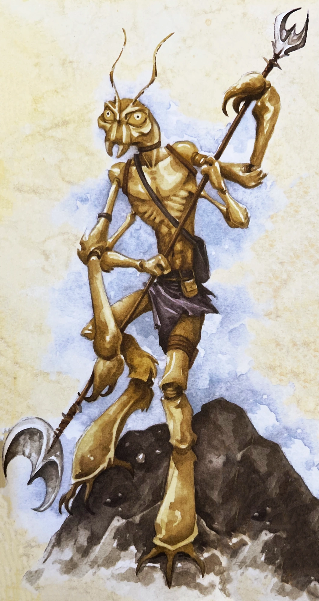 A thri-kreen wielding a gythka and hurling a chatkcha.