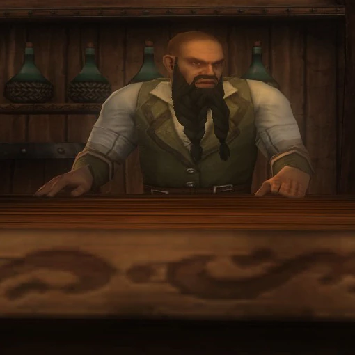 Trosken had a bald head and a long dark brown beard braided into two forks. He wore a neat green waistcoat, and stepped up on a short bench to reach the proper height while tending the bar.[1]