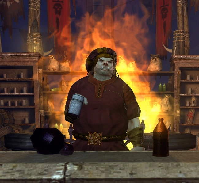 As the owner of the Fallen Tower tavern, Vagdru's job was to sell food and drinks to his fellow orcs and other patrons, and to manage the tavern. Vagdru was known for his homemade beer, which only orcs found palatable.[4]