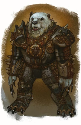 Warden archons were large, bear-like archons with dexterous hands instead of paws,[3][4][5] but these furry hands ended in razor-sharp, black claws.[3][4][2] They were about the size of an ogre,[2] standing between eight[3][4] and ten[2] feet tall. Their thick fur was colored white[2] or like silver or gold.[9] When one looked into their tiny,[3] clear,[3][4] black[2] eyes, their intelligence was obvious.[3][4][5]