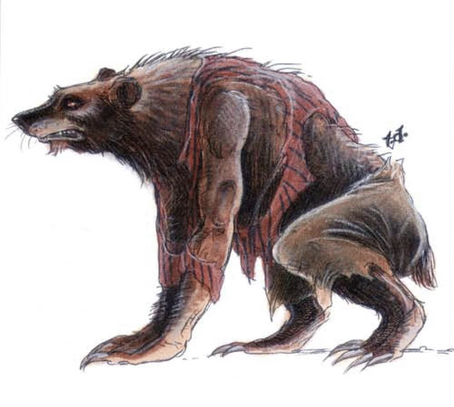 Werebear humanoid forms were often large, heavily muscled, and covered in hair. Their hair was thick and shaggy with males typically having beards, and hair color ranged from brown, black, and blonde to even red or ivory. Werebears dressed in simple garments that could be easily removed or repaired. Their ursine forms most often resembled a brown bear,[3] although their human form's hair always matched their bear form's fur color,[2] with brown being common in forest regions and ivory being common in frozen regions.[4] They also possessed a hybrid form that resembled a bipedal bear with paws and long claws.[3]