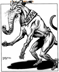 Focused on their vineyards, winemaker genies were quiet creatures. These genies possessed the head of a cat, body of a dog, and a long elephant-like trunk that they used to crush grapes. They stood erect at about four to five feet (1.2 – 1.5 m) tall. These creatures did not wear clothes but used grape leaves to cover themselves.[1]