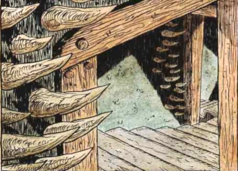 A coin vault was located under the stairs to the cellar. It was accessed by removing a stone in the wall and operating a lever that released one of the steps, allowing it to be lifted up. All doorways that led to the stairs were decorated with what appeared to be dragon talons around the frames. It was hoped that the unusual appearance would discourage thieves or at least distract them into stealing something worthless. The adornments were actually made from rothé horn, reptile hide, and clay.[3]