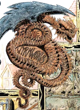 The building was almost four stories tall because the windowless ground-floor shop area had a vaulted dome for a ceiling. Above this were two more stories that had walk-out balconies and bay windows. The exterior was made of stone and had slate roofs. Off to the left side was an attached workshop. A large sign, ornately carved like a coiled dragon, hung out front advertising "The Wyrmworks".[1][2][note 1]