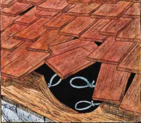 Cutaway view of the deceptively loose roof tiles that conceal wire noose traps.