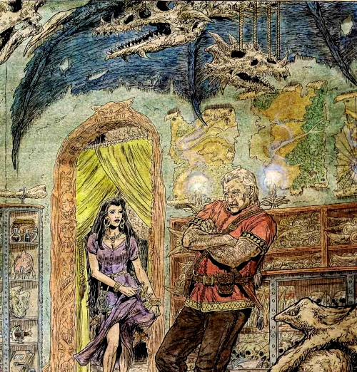 Dragon skulls hang from the ceiling, a blue dragon wing adorns the back wall along with artistic maps. Below are racks of map tubes and some humanoid skulls. Alrue exits a back room and approaches Delgrath in the foreground.